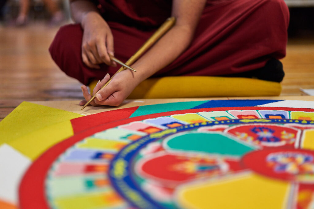 Per alcuni giorni sarà possibile assistere alla costruzione del Mandala, osservando da vicino un processo che unisce concentrazione, visualizzazione, precisione e intenzione compassionevole, dedicata alla pace nel mondo.